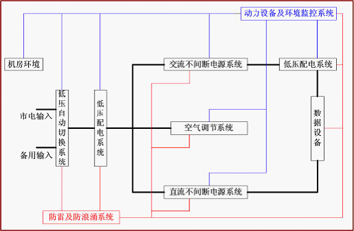 随着当今社会信息化程度需求的不断提升,各行各业越来越依赖于大型数据中心进行海量数据信息的处理。大型数据中心的特点是机房规模大,通常超过500平米,内部放置机柜数量众多。其对于能源的需求体现在容量大、可靠性要求高、升级扩容需求较多等方面。涉及到的硬软件设备同样众多,且配置非常复杂。高可靠性、成长性、智能化等这些特征是大型数据中心基础设备所必须具有的功能。