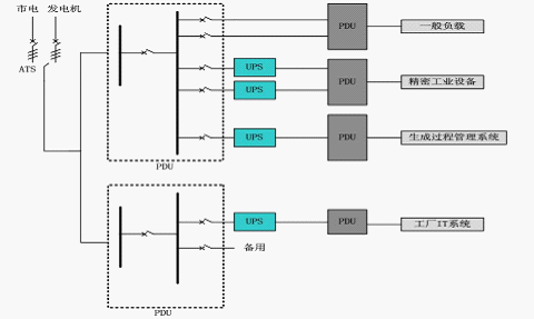 由于自动化程度的不断提高,现代工业大量使用生产过程管理与控制系统,这些系统的供电可以选择与精密工业设备使用同一组UPS系统,也可以选择采用独立的UPS系统。由于生产过程管理系统一般不存在冲击性负载,因此对UPS的带载能力要求不高,而对UPS的智能化程度(如远程监控等功能)相对要求较高。