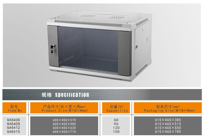 框架结构,承重达60公斤,上部和下部走线通道。前门带锁钢化玻璃门,快开侧门,方便安装和维护。侧门可加锁。可选择轴流风机,2对竖式方孔条。